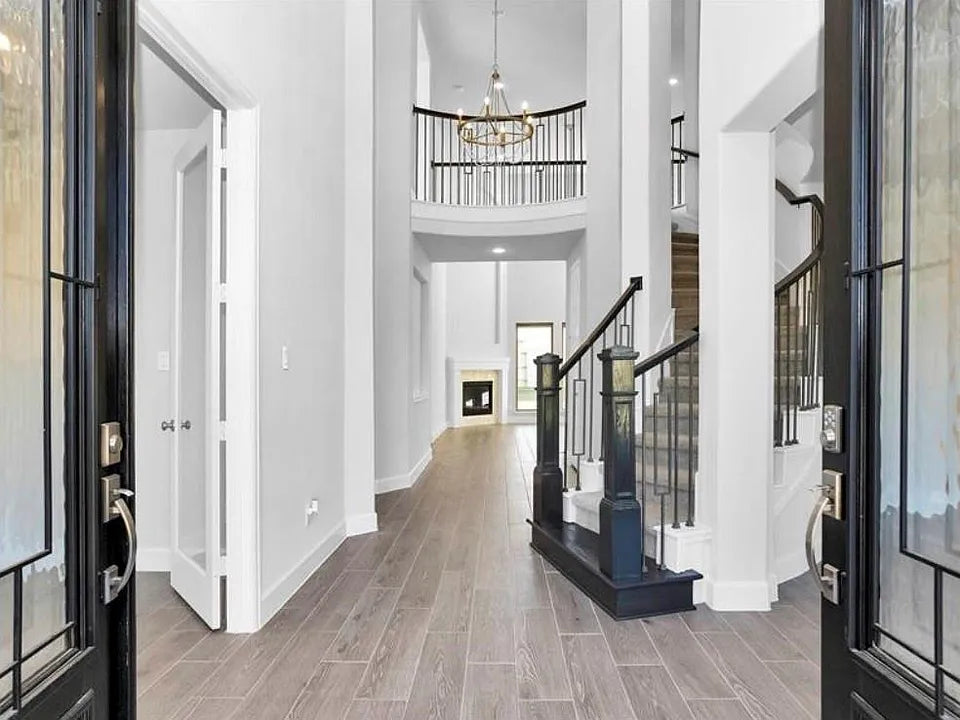 - Grand Entryway: The moment you walk in, you’re greeted by a curved staircase and soaring ceilings that create a warm yet impressive first impression.